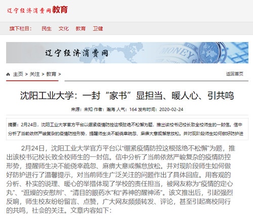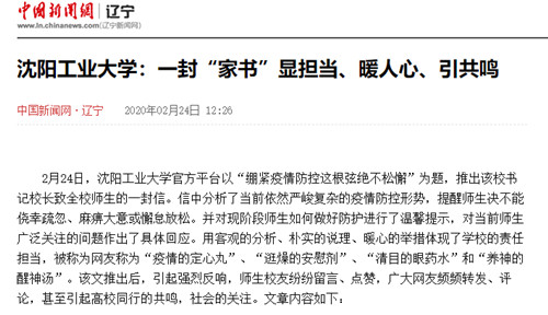 2月24日,中国新闻网辽宁频道、辽宁经济消费网、东北新闻网、今日头条、二三里资讯等媒体平台以“一封‘家书’显担当、暖人心、引共鸣”为题报道了我校官方平台以“绷紧疫情防控这根弦绝不松懈”为题,推出的校书记校长致全校师生的一封信。报道中指出,这封信分析了当前依然严峻复杂的疫情防控形势,提醒师生决不能侥幸疏忽、麻痹大意或懈怠放松,并对现阶段师生如何做好防护进行了温馨提示,对当前师生广泛关注的问题作出了具体回应。信中用客观的分析、朴实的说理、暖心的举措体现了学校的责任担当,被称为网友称为“疫情的定心丸”、“逛燥的安慰剂”、“清目的眼药水”和“养神的醒神汤”。